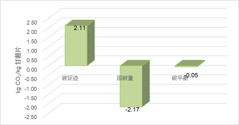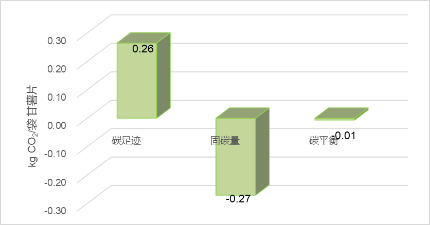 在甘薯种植阶段,每生产1 kg甘薯片所需甘薯带来的固碳量约为1.95 kgCO2。因此,甘薯片的碳平衡为-0.05 kgCO2/kg。每袋甘薯片的碳平衡为-0.01 kgCO2/袋。